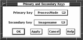 To re-sort the process data, release on the Report keys... menu item. Performance Manager displays the Primary and Secondary Keys dialog box.