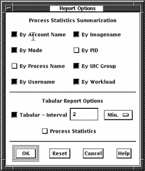 Displays options for summarizing process statistics and for specifying the reporting intervals, as shown in the following screen: