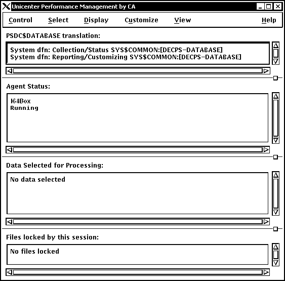 When initiated, DECwindows Motif displays its main window, from which you select the activity you want to perform. It reflects the status of your use of the application and, if available, the status of data collection in your environment.