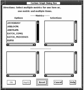 For most custom categories, additional items appear in the lower option box. You can display up to six metrics when using system metrics. For other types of metrics you can display up to six metrics when one item is chosen and up to six items when one metric is chosen.