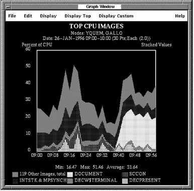 Pull down the Display Top menu to display graphs of top system use. Point to a Top menu item and click the submenu icon. Click a menu item in the submenu. The graph you have chosen is displayed, as shown in the following screen: