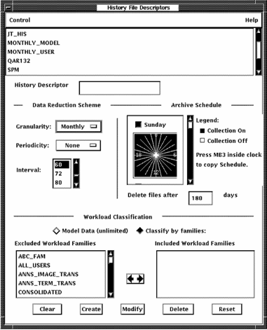 The Performance Manager displays the History File Descriptors dialog box.