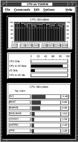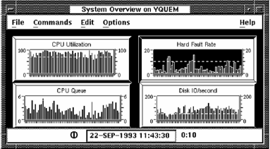In the following example, double-clicking on the metric CPU Utilization instrument in the Performance Manager System Overview panel launches the CPU panel on node YQUEM. The node YQUEM and the current interval are passed to the panel CPU.