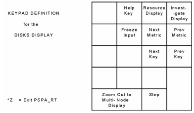 Press PF2 to view the keypad for the Disks display. The following illustration shows the functions of the Disks display keypad.