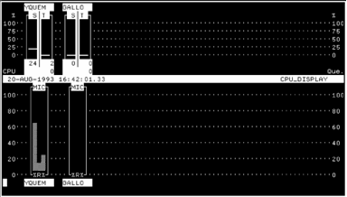 The name of the node is given at the top of an individual node graph, while the average number of processes in the CPU queue for the node is shown as a number at bottom right. There is a real queue if this number is greater than 1. This number is equivalent to the sum of processes in the computable queue (COM). Each node graph has two columns as follows: