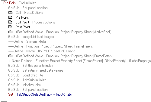 When end users click Maintain Projects on your top‑level panel, the property sheet should open to the Projects and Tasks tab. When they click Maintain Employees, the property sheet should open to the Employees tab. Before you can do this, you have to modify the Project Property Sheet function to accept a starting tab number as an input parameter.