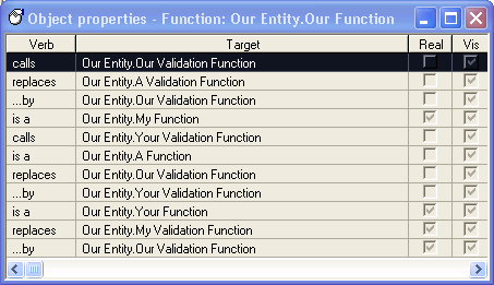 If you view the Object Properties for the function Our Entity.Our Function then you can see the two calls triples, both visible. There are two important points to note: