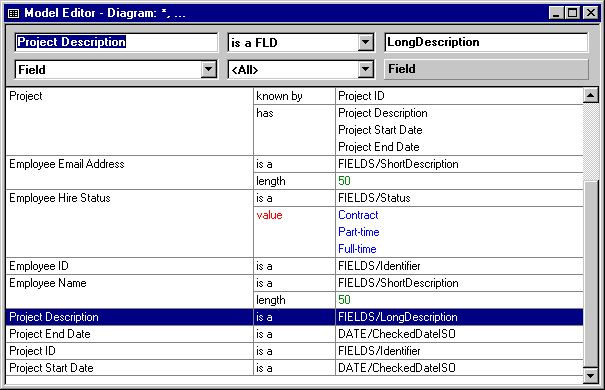 When you drag one or more objects to the body of the Model Editor, the display changes to show you only the triples that define those objects. This is called focusing the Model Editor. When you drag the Project ID field to the Model Editor, it focuses on this field, showing the triple Project ID is a FIELDS/Identifier. This still does not tell you much.