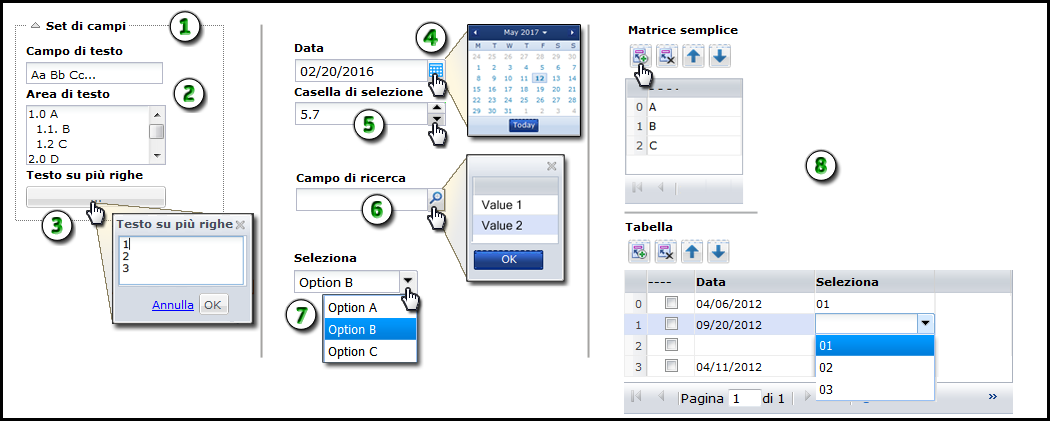 Matrice semplice e tabella: utilizzare una matrice semplice per archiviare un unico tipo di dati in una tabella. Utilizzare una tabella per archiviare più colonne di dati. Questi elementi del modulo includono opzioni per aggiungere, eliminare e spostare le righe. |