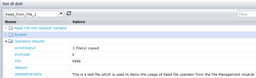 Il contenuto del file viene salvato nel set di dati DataRead e non nel set di dati del sistema, come illustrato di seguito: