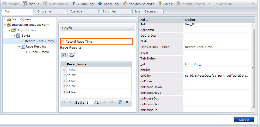 Bu örnek, bir yarıştaki ilk beş bitiş zamanını bir Tablo form öğesinden özel bir veritabanına geçirmek için aşağıdaki form komut dosyasını kullanır. Record Race Times (Yarış Zamanlarını Kaydet) onay kutusu onClick olayı, tablo verilerini almak, verileri geçirmek ve sonuçları kaydetmek için işlv çağrılarını başlatır.