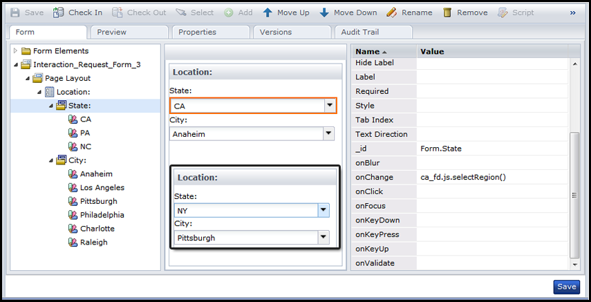 In this example, you are developing a form for a company that operates in three primary regions (California, Pennsylvania, and North Carolina). In each state, the company has a primary and secondary office location that the name of the city identifies. The stakeholders responsible for implementing company policy want the form to meet the following business requirements: