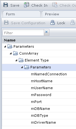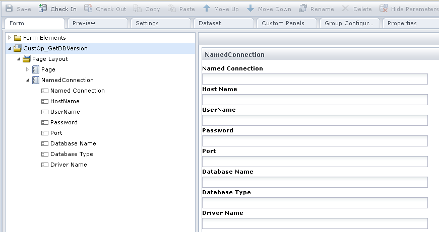 Name the form elements as mNamedConnection, mHostName, mUserName, mPassword, mPort, mDBName, mDBType, and mDriverName. Ensure that the form elements names are similar to the variable names defined in the Group Configuration tab.