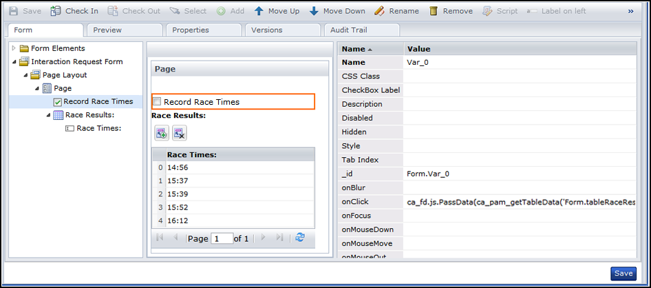 This example uses the following form script to pass the top five finishing times in a race from a Table form element to a custom database. The Record Race Times check box onClick event initiates function calls to get the table data, pass the data, and record the results.
