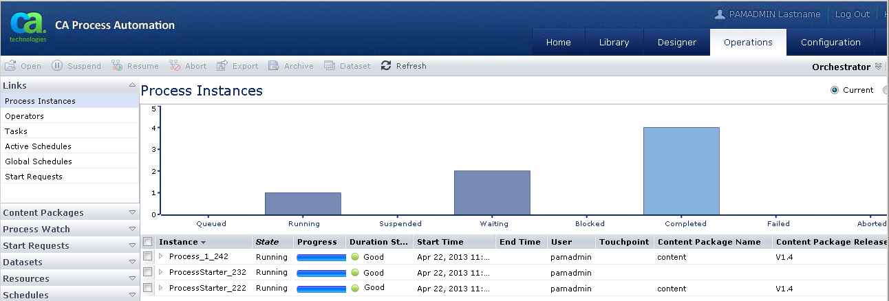 The Operations page is a dashboard that provides an overview of the automation objects in the CA Process Automation application. The Operations page lets you view, manage, start, and run instances of the automation objects in the product. The following illustration shows the Process Instances link in the Links palette.