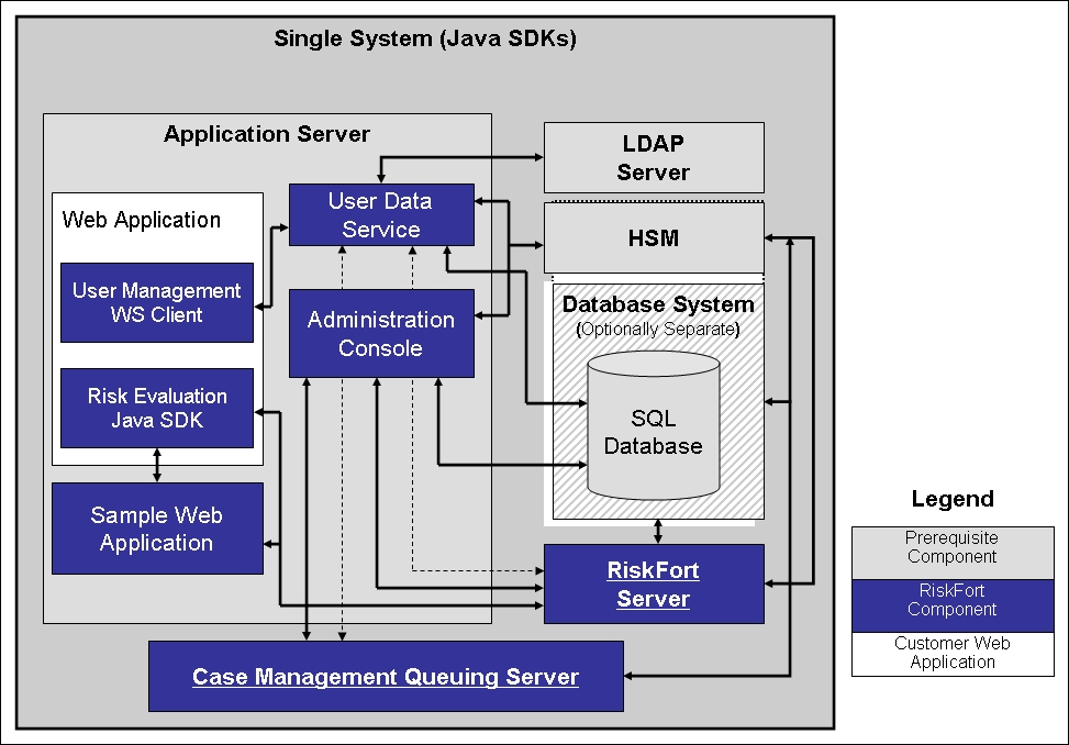The following figure illustrates RiskMinder Server and Java SDKs deployed on a single system.