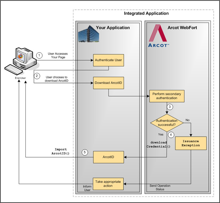 If the secondary authentication was successful, only then your application should call the downloadCredential() function in the CredentialIssuance interface. This call downloads the corresponding ArcotID PKI to the application.