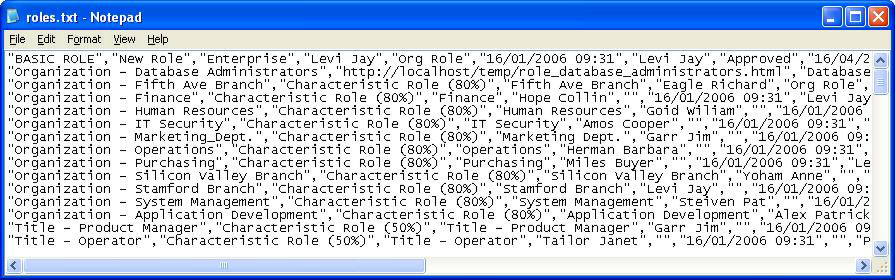 The Roles entity file does not require a header row. The file has one row per role definition, each with the following fields: