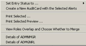 The primary audit alerts management options are accessed by highlighting one or more AuditCard records and activating the right-click control menu.