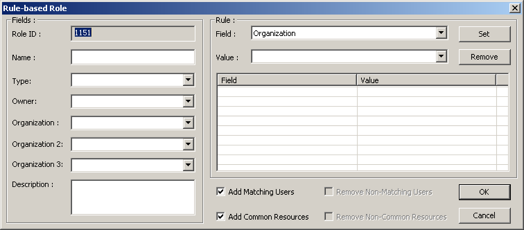 Rules are made up of a series of Field and Value pairs, selected and then set in the Rule group box in the right side of the Rule-base Role window.