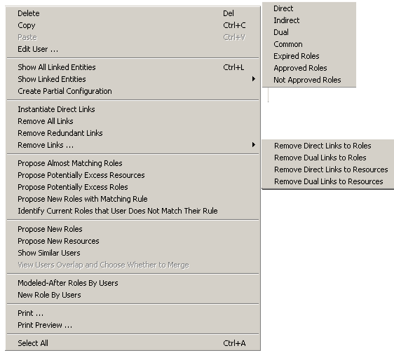 Show Linked Entries: Direct, Indirect, Dual, Common, Expired Roles, Approved Roles, Not Approved Roles. |