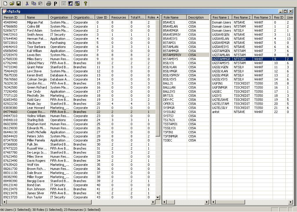 When a configuration is opened, a three-panel window appears containing individual user data in the Users Panel, physical resources data in the Resources Panel and roles data; that is, the link between users and resources, in the Roles Panel.