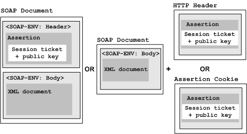 Assertions found within assertion cookies take precedence over assertions in the SOAP envelope or HTTP header. The SOA Agent first collects all SAML Session Ticket assertions from the cookie and the header or envelope as specified in the authentication scheme. The agent then tests each assertion until it finds the first one with a valid session ticket (that is, it can be decrypted with the agent key) and valid signatures, if they are required. Authentication is then performed using this assertion.