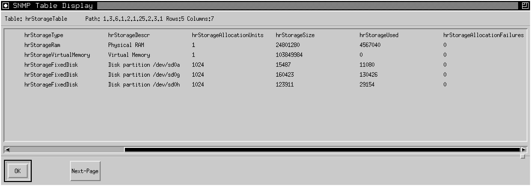 このテーブルは、メモリ不足およびバッファ不足タイプのエラーを診断するのに役立つように用意されています。 さらに、メモリ、ディスク、またはバッファ使用状況を追跡するために役立つパフォーマンス モニタ ツールでもあります。 以下の図に、ホスト リソース ストレージ グループのサンプル出力を示します。