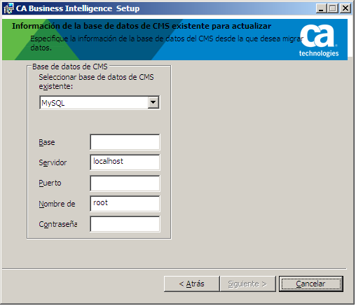 Nota: Si está migrando desde una versión de MySQL que BusinessObjects Enterprise ya ha instalado previamente, el nombre de usuario que debería utilizar es raíz (no el nombre que ve en DSN).