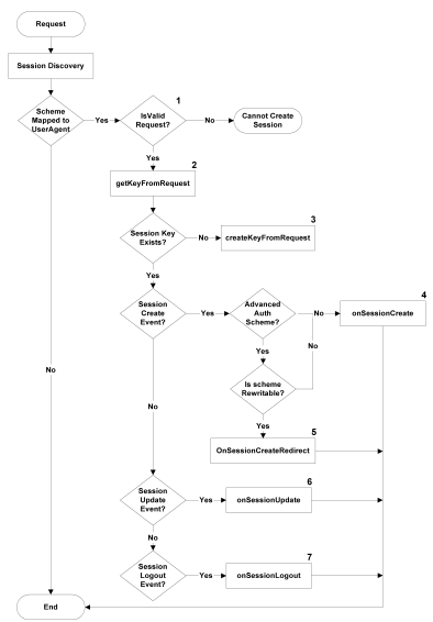 - onSessionCreateRedirect—On the event of session creation, if the scheme is rewritable, this method is called. This method may be implemented with any code that should be called at the inception of a new session for a rewritable session scheme.