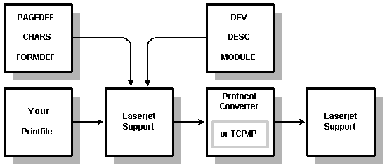 If you define PAGEDEFs, FORMDEFs, and CHARS, which specify formatting similar to real AFP definitions, most line mode prints can be handled on printers supported by this interface as well as on AFP printers, and print files can be routed to either type. It is not possible to print formatted composed‑text files; only line data files are supported.
