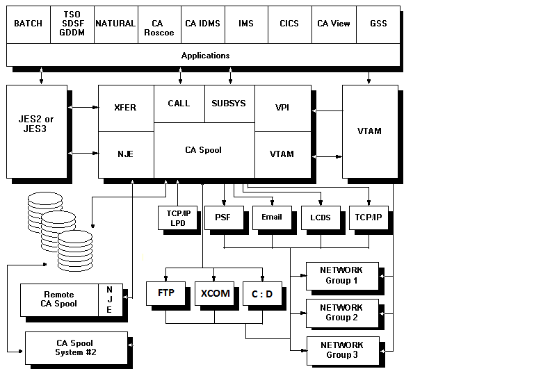 The following illustration shows how CA Spool is related to the other system components in an IBM z/OS environment.