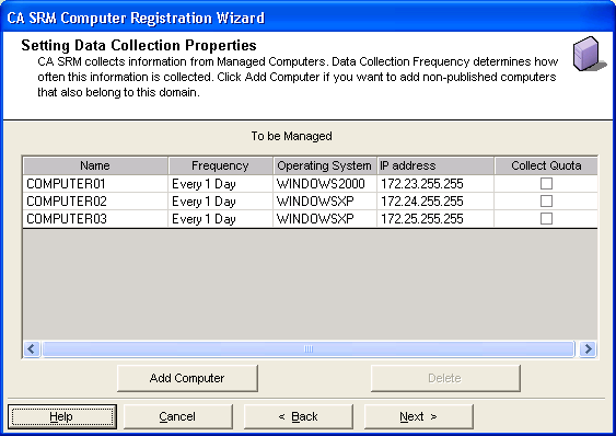 The Computer Registration wizard lets you specify the computers from which to collect information and define properties for the data collected.