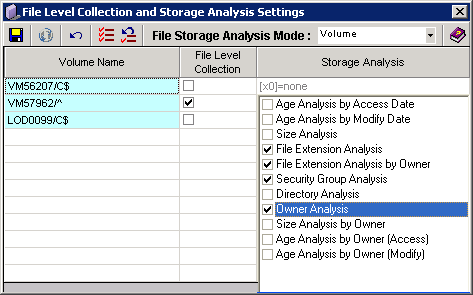 Note: Enabling the File Level Collection flag, allows you to modify Storage Analysis flags as well as enables Volume Data Collection for the specific managed machine. Click a cell under the Storage Analysis option to view the list of analysis types available for the collection.