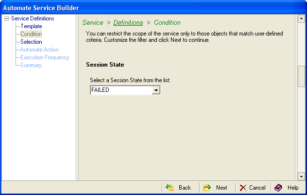 - Click the Configuration menu and then New in the Automate table. The Automate Service Wizard opens. From the Automate table main menu, select Configuration, and New. Expand Backup Products, then Tivoli Storage Manager, and select Session State.
