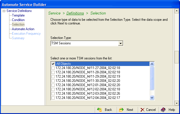 - Select TSM Sessions from the drop-down list and check All Objects: