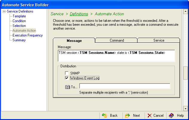 - Enter the message that you want to send when the conditions have been met in the Message text box. Check the Windows Event Log check box: