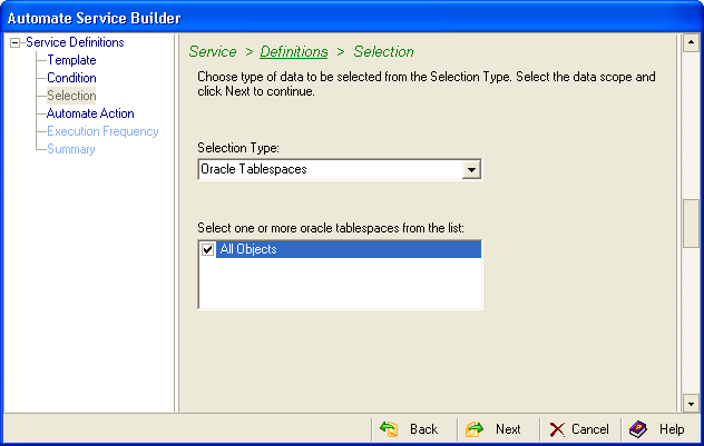 - Click the Configuration menu and then New in the Automate table. The Automate Service Wizard opens. Expand Templates, Applications, Oracle, and then select Full Table Spaces.