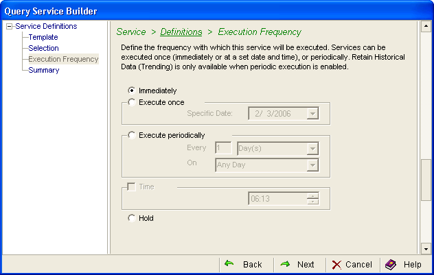 This section describes how to create a query using the Service Builder Wizard. The Service Builder Wizard contains predefined sets of sample services. After completing the configuration steps, the service is ready to use. If you want to tailor a service, use the Query Service Builder Wizard to customize it.