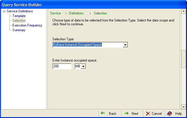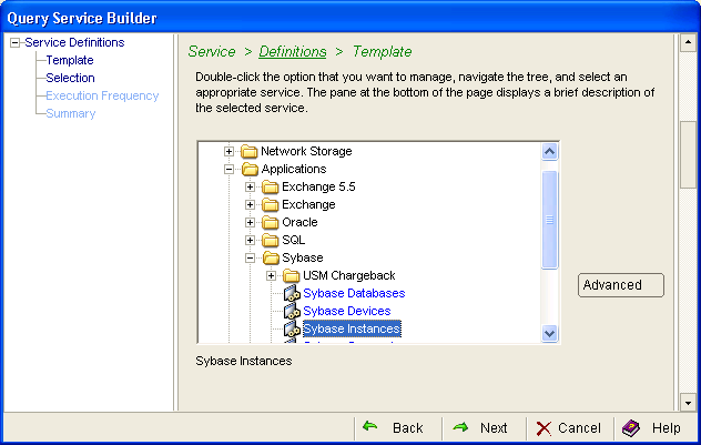 Click the Configuration menu and then New in the Query table. The Query Service Wizard opens. Expand Templates, Applications, Sybase, and then select Sybase Instances: