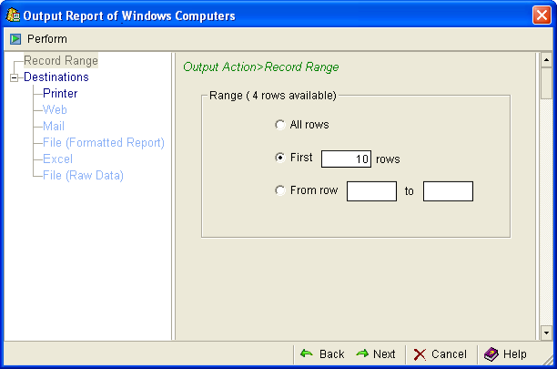 - From the Windows Computers table main menu, select File, Output Report. The Record Range dialog lets you select how many rows of the table view you want to include in your report. To create a report showing the first 10 computers with the most occupied space, select First and enter 10 in the Rows text box:
