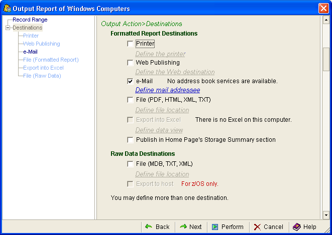 - Click Destinations and clear the Printer check box (selected by default) and check the e-Mail box. The Mail destination is now active. Select it: