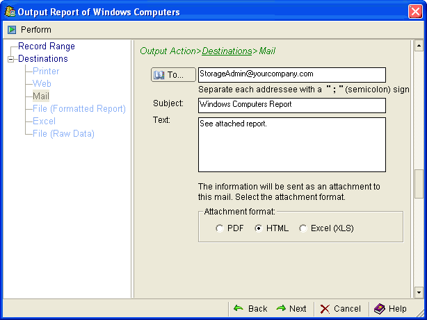 - Select a format in which to send the report. You can email reports in Adobe PDF, HTML, or as an Excel spreadsheet: