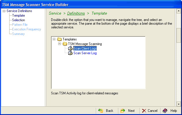 - From the TSM Message Scanner table main menu, select Configuration, New. The Template dialog of the TSM Message Scanner Server Builder Wizard opens. Expand TSM Message Scanning and select Scan Client Logs: