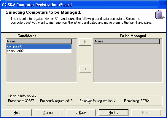To select a computer for registration, highlight the computer in the Candidates table and click the right arrow