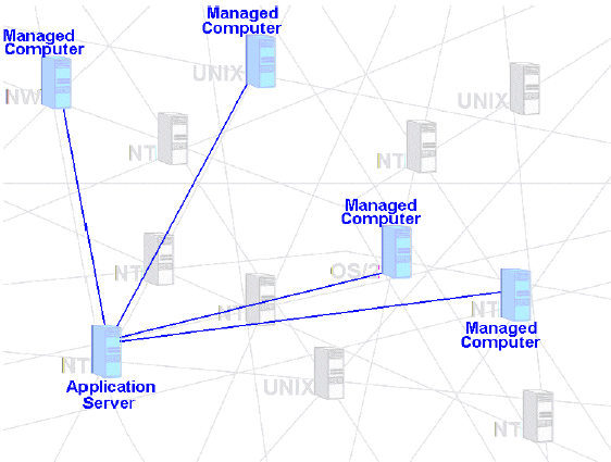 The architecture of CA SRM is similar to that of TSM in that a dedicated server acts as a hub for a group of clients from which it collects data and for which it performs a set of storage management operations. The CA SRM server is called the Application Server. CA SRM manages its client computers. Each client computer has a CA SRM agent installed on it to collect data. The following diagram illustrates this: