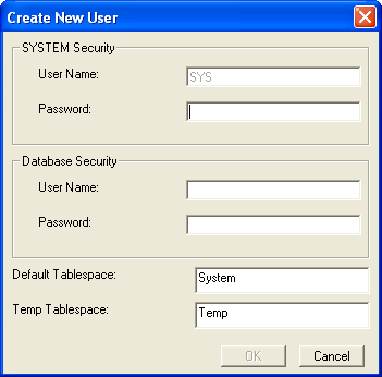 - (Optional) Click Create a New User button to create a user in the Oracle database. Enter the system security user name and password. You also need to provide the database user name and password. and the default tablespace and temp tablespace:
