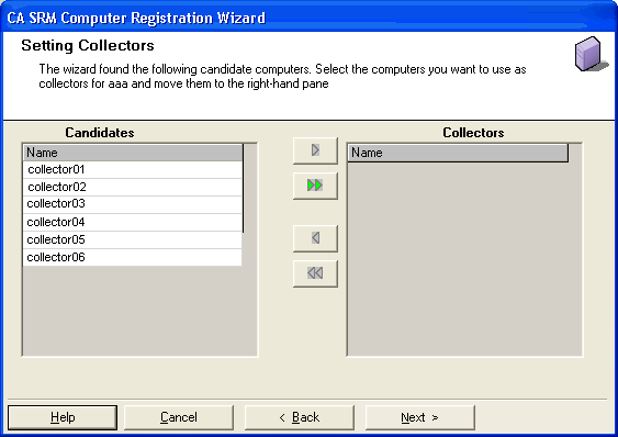 The Candidates table lists all the computers that are eligible to serve as proxy collectors for the target computer. To designate a computer as a proxy collector, highlight the computer in the Candidates table and click the right arrow