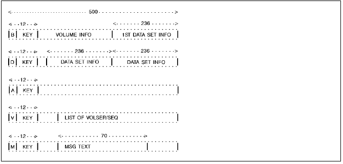 The Volume Master File consists of a 500-byte record for each volume in the tape library. The name, number, status and characteristics of each data set in the tape library are maintained in this file. The following records comprise the VMF: