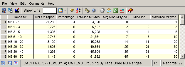 In this example a table view of the summary is displayed by selecting the By Used MB Range object in the Summaries folder under the CATLMS folder in the Object Tree and clicking the cogs: